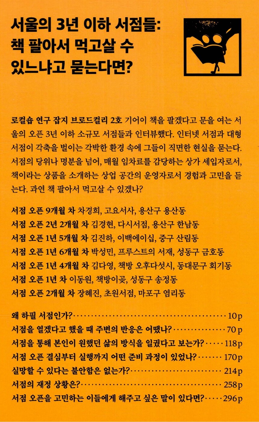 기어이 책을 팔겠다고 문을 여는 서울의 오픈 3년 이하 소규모 서점들과 인터뷰했다. 인터넷 서점과 대형 서점이 각축을 벌이는 각박한 환경 속에 그들이 직면한 현실을 묻는다. 서점의 당위나 명분을 넘어, 매월 임차료를 감당하는 상가 세입자로서, 책이라는 상품을 소개하는 상업 공간의 운영자로서 경험과 고민을 듣는다. 과연 책 팔아서 먹고살 수 있겠나?