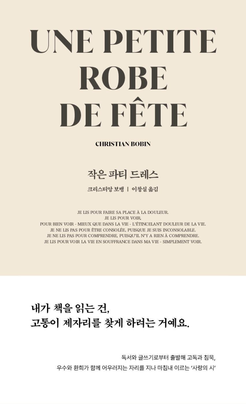 보뱅의 산문집 『작은 파티 드레스』는 독서와 글쓰기로부터 출발해 고독과 침묵, 우수와 환희가 함께 어우러지는 자리를 지나 마침내 ‘사랑의 시’에 이르는 아름다운 여정이 있다. 책을 읽지 않는 삶은 “우리를 잠시도 놓아주지 않는 삶’이며, ‘신문에 나오는 이야기들처럼 온갖 잡다한 것들의 축적으로 질식할 듯한 삶’이라 말하는 작가는 소음과 부산함으로 가득한 출구 없는 세상에 출구를 그리고, 깊은 사색으로부터 퍼지는 변함없는 차분하고 조용한 목소리로 우리를 안내한다.