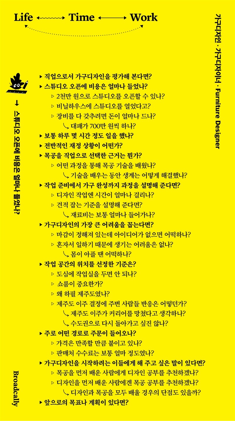 우리는 삶 대부분의 시간을 일로 채우게 된다. 당신은 지금 어디에서 어떤 일을 하고 있는가? 선택할 수 있다면 계속하시겠는가? Life, Time, Work, 라이프타임워크 시리즈는 일을 둘러싼 개인의 삶을 조명한다. 일과 삶의 충돌과 조화를 연구한다.