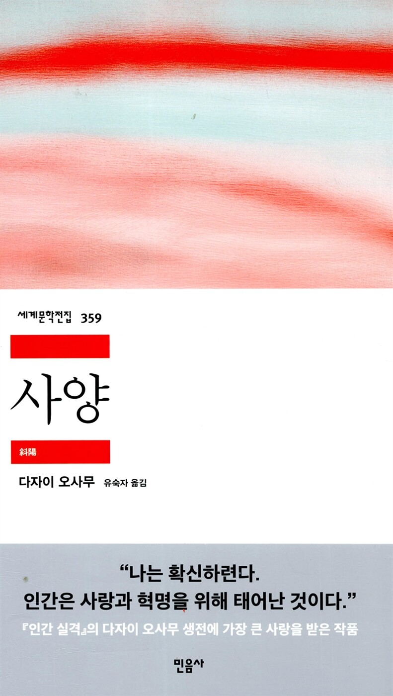 민음사 세계문학전집 359번으로 다자이 오사무 생전에 가장 큰 사랑을 받은 작품 『사양』이 출간되었다. 패전 후, 정신적 공황 상태에 빠진 일본의 젊은이들에게 열렬한 지지를 받았던 다자이 오사무는 1947년에 『사양』을 출간했으며 단숨에 베스트셀러를 기록했다. 당대에 몰락하는 귀족을 지칭하는 ‘사양족’이라는 유행어를 낳을 정도로 일본 사회에 일대 파문을 일으킨 작품이다.